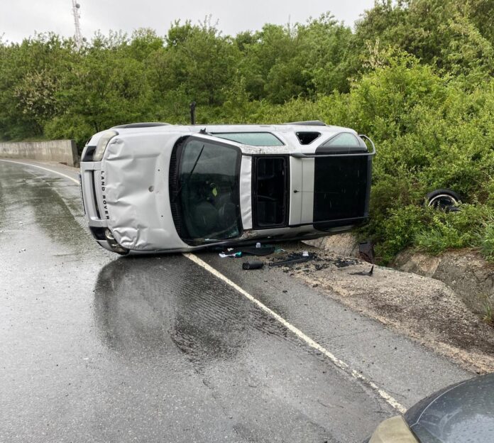În această după-amiază, un șofer de 65 de ani, din comuna Valea Mare, s-a răsturnat în șanț cu un SUV Land Rover pe care îl conducea pe Drumul Național 65 – European 574.