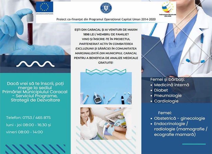”Profită de gratuitate la unele analize medicale oferită prin Poiectul co-Finanțat din Programul Operațional Capital Uman 2014-2020.Specializările medicale vizate pentru femei și bărbați sunt:– Cardiologie– Pneumologie– Medicină internă– Diabet.Totodată, femeile pot beneficia de analize gratuite la obstetrică-ginecologie, endocrinologie, radiologie (mamografie).Înscrierile se fac la sediul Primăriei Caracal – Serviciul de Programare, Strategii de Dezvoltare.Informații suplimentare: 0764 622 864 / 0763 761 074, de luni până joi între orele 08.00-16.30 și vineri între orele 08.00-14.00.”, se arată în anunțul făcut de Primărie