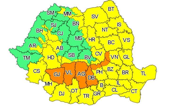 Administraţia Naţională de Meteorologie a emis o avertizare Cod portocaliu de instabilitate atmosferică accentuată în judeţele Gorj, Vâlcea, Argeş, Dâmboviţa şi zona montană a judeţelor Prahova, Buzău şi Vrancea, şi o avertizare Cod galben de instabilitate atmosferică temporar accentuată în aproape toată ţara, valabile până luni seara.
