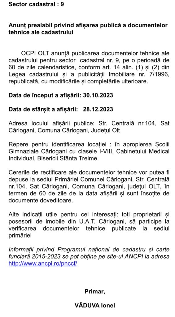 PublicitateActualizat: 26 octombrie 2023AnunțAutor Anca Spiridon23 octombrie 2023AcțiuneFacebookXPinterestVKWhatsAppLinkedinEmailTelegramCopy URL Îți recomandămActualitateOana Petcu - 2 martie 202686% din cele 105 construcții ilegale depistate pe plaje vara trecută au fost demolate de operatorii economici. ABADL cere despăgubiriActualitateOana Petcu - 2 martie 2026Alimentele de bază s-ar putea scumpi din nou în această lună. Consultant fiscal: „Costurile mai mari se vor vedea direct la raft”ActualitateOana Petcu - 2 martie 2026SRI lansează un proiect pentru prevenirea radicalizării tinerilor. Cât costă și cum va funcționa programul PREVISIO 2Anca SpiridonAcțiuneFacebookXPinterestVKWhatsAppLinkedinEmailTelegramCopy URL Articolul precedentCe sumă a recuperat statul de la „monstrul din Caracal”Articolul următorOlguța Alexandrina Filip, de la Cezieni va reprezenta județul Olt la Gala Radio România - Advertisement - LĂSAȚI UN MESAJAutentificați-vă pentru a lăsa un comentariu Gazeta Publică- Advertisement -Știrile ZileiPublicitateAnca Spiridon - 28 aprilie 2026Informare – Primăria Milcov Această informare este efectuată de Comuna Milcov ce intenționează să solicite de la Sistemul de Gospodărire a Apelor Olt... PoliticăNicușor Dan a semnat demisiile miniștrilor PSD și a numit interimari Gazeta Publică - 25 aprilie 2026 EconomieRomânia rămâne țara cu cel mai mare deficit bugetar din UE în 2025, potrivit Eurostat. Cum arată situația comparativ cu alte state Oana Petcu - 22 aprilie 2026 Actualitate„Performanța de astăzi este rezultatul muncii și al disciplinei pe care le aplic zilnic” Oana Petcu - 27 aprilie 2026 AdministrațieOrașul prinde viață: amplă campanie de modernizare și întreținere a spațiilor urbane Gazeta Publică - 24 aprilie 2026 - Advertisement -Citește mai multeAnunț Publicitate Anca Spiridon - 28 aprilie 2026 Informare – Primăria Milcov Publicitate Anca Spiridon - 28 aprilie 2026 Anunț Găneasa Publicitate Gazeta Publică - 28 aprilie 2026 Anunț – S.C.DEZVOLTARE URBANĂ SLATINA S.R.L. Publicitate Anca Spiridon - 24 aprilie 2026 - Advertisement -