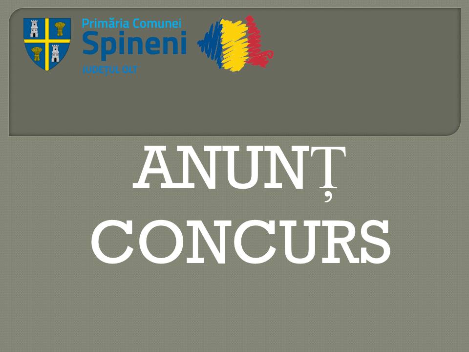 PRIMARIA COMUNEI SPINENI, cu sediul în Comuna Spineni, strada Principala Alunisu nr. 85, județul Olt, organizează concurs, pentru ocuparea următorului post contractual, aprobat prin H.G. nr. 286/2011, modificată şi completată de H.G. nr. 1027/2014.