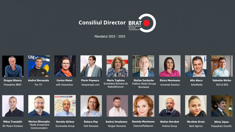 BRAT – Biroul Român de Audit Transmedia – organizația de măsurare a performanțelor produselor media online, outdoor, radio și print care reunește 160 de membri din industrie (publisheri, clienți, agenții de publicitate, companii OOH, radiodifuzori și organizatori de evenimente) și-a desemnat conducerea pentru perioada 2023-2025, potrivit unui comunicat de presă.