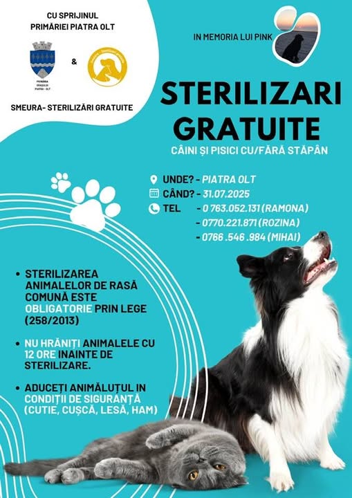 ”Cu sprijinul Primăriei Piatra-Olt și în parteneriat cu echipa Smeura, lansăm o acțiune de iubire și responsabilitate față de „prietenii” noștri necuvântători. Iubitorii de animale știu: Sterilizarea înseamnă mai puțină suferință, mai puțină abandonare, o comunitate civilizată. Grija față de animale nu este o opțiune, ci o datorie. Consultați afișul de mai jos pentru programări și recomandări importante. Vă rugăm să le respectați pentru desfășurarea în condiții optime”, anunță reprezentanții Primăriei.