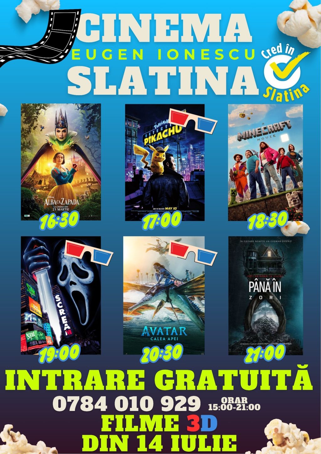 Începând cu 14 iulie, slătinenii sunt așteptați la Cinema cu un super program de filme pentru toate gusturile, acces fiind GRATUIT. Filmele marcate cu ochelari 3D pot fi vizionate cu ochelari proprii sau achiziționați direct de la cinema!
