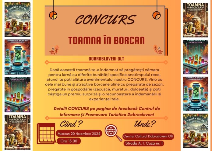 Cele interesate să ia parte la acest concurs sunt așteptate miercuri, 20 noiembrie 2024, ora 15.00, la Centrul Cultural Dobrosloveni, cu cele mai bune și aspectuoase preparate conservate pregătite în gospodărie.