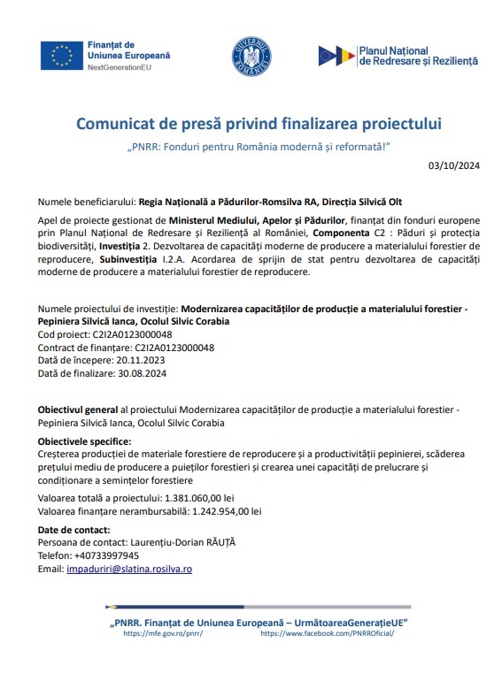 moderne de producere a materialului forestier de reproducere. Numele proiectului de investiție: Modernizarea capacităților de producție a materialului forestier- Pepiniera Silvică Ianca, Ocolul Silvic Corabia
