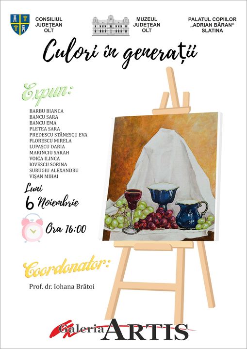 Luni, 6 noiembrie 2023, ora 16.00, va avea loc vernisajul expoziției „Culori în generații“ a 12 elevi frumoși și talentați sub coordonarea prof. dr. Iohana Brătoi, la Galeria „Artis” a Muzeului Județean Olt.