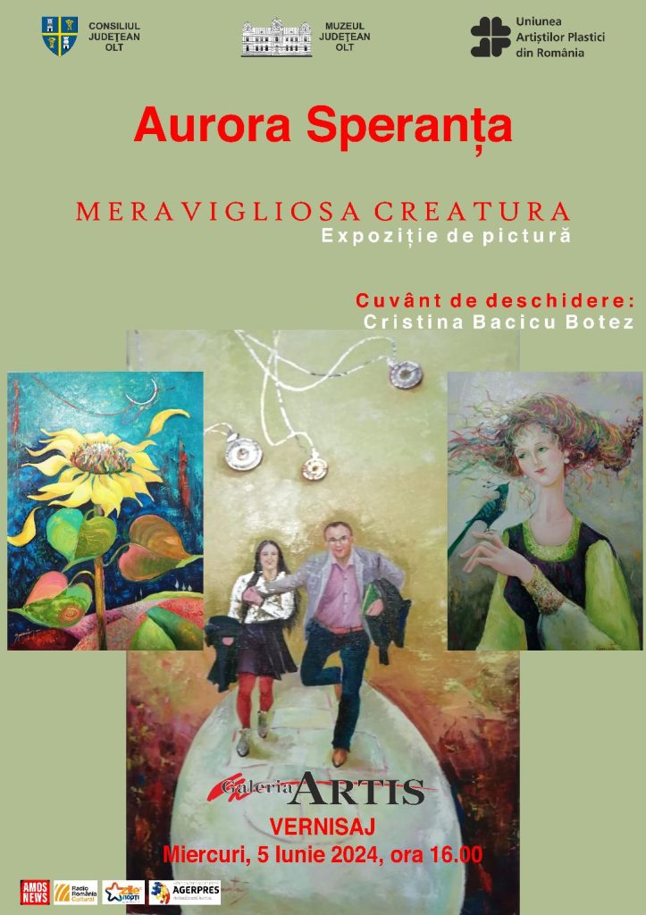 Expoziția de pictură „Meravigliosa creatura” a pictoriței Aurora Speranța Cernitu va fi găzduită de Galeria „Artis“ a Muzeului Județean Olt în data de 5 iunie 2024, de la ora 16:00.