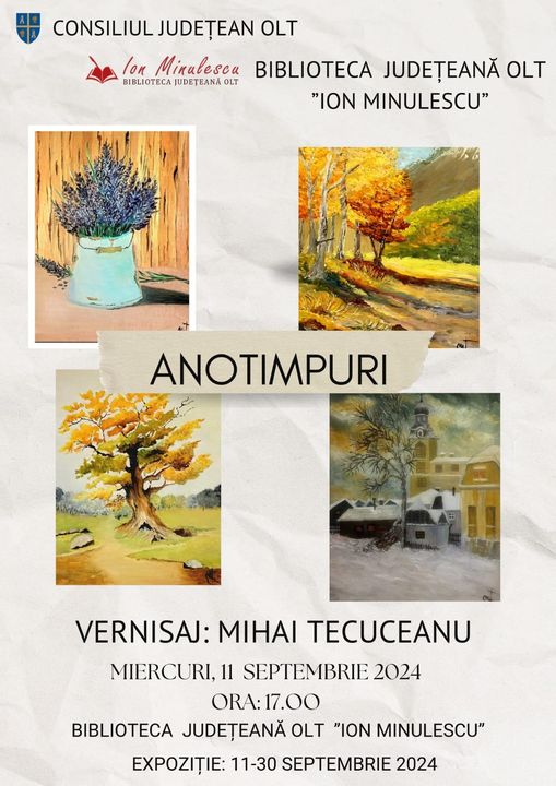 ,,Dragi prieteni, am placerea sa vă anunț că in data de 11 septembrie la ora 17,00 va avea loc vernisajul expozitiei mele intitulata Anotimpuri. Expoziția va fi gazduită de Biblioteca Judeteana Olt „Ion Minulescu” până in data de 1 octombrie. Vă astept să îmi fiți alături și să vizionati tablourile ce constituoe munca mea de anul acesta,, este invitația artistului.