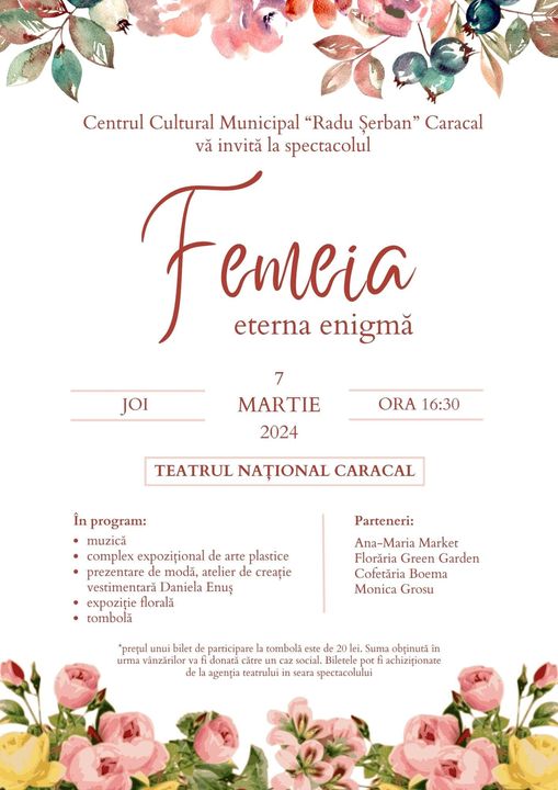 Joi, 7 martie, ora 16.30, la Teatrul Național Caracal, vă invităm la un spectacol special – ”Femeia, eterna enigmă” – un omagiu adus femeilor din viața noastră.