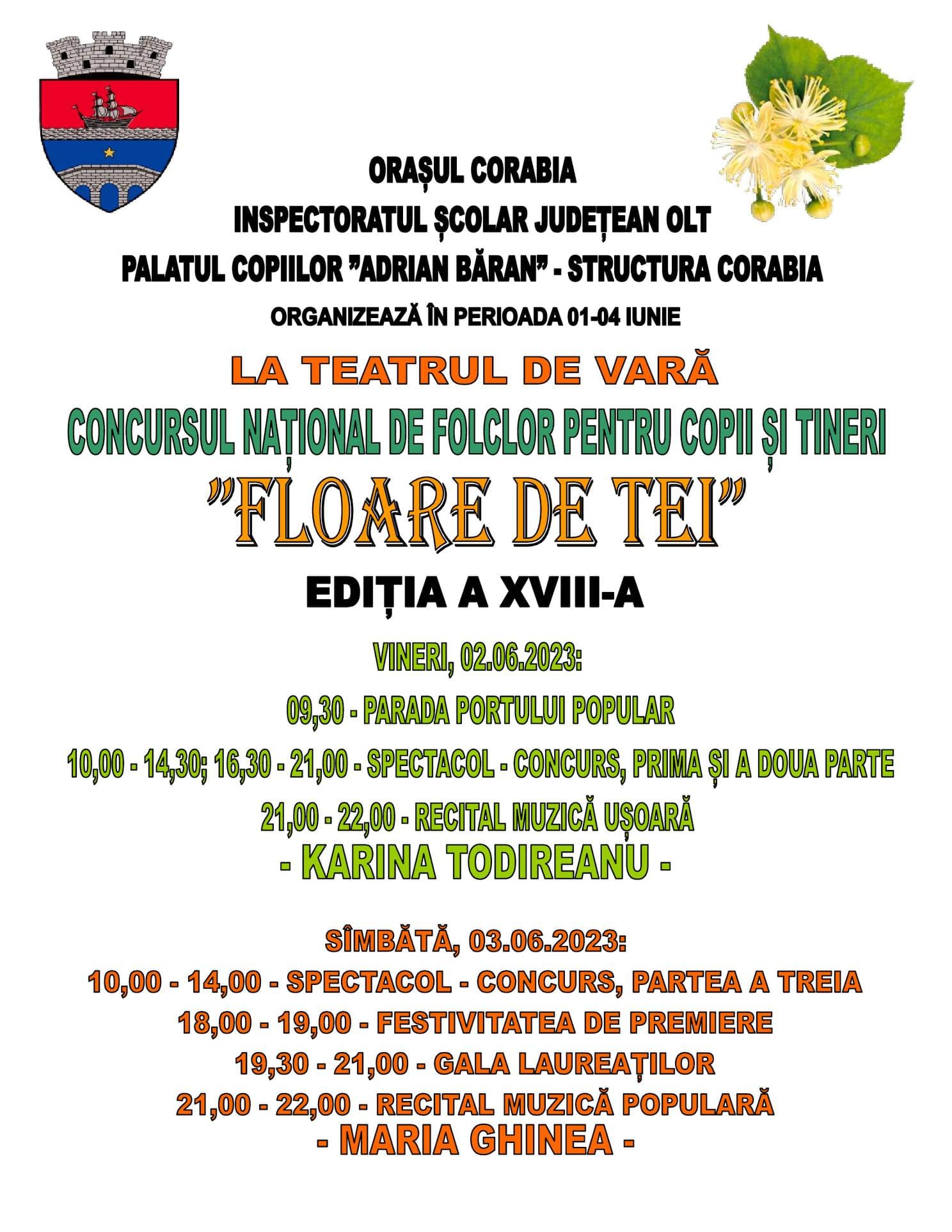 Cea de a XVIII-a ediţie a Concursului Naţional de Folclor pentru Copii şi Tineri „Floare de Tei” se desfăşoară, la începutul lunii vitoare, la Corabia.