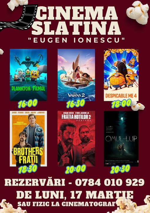 Începând de luni, 17 martie, slătinenii pot viziona noi filme la Cinema „Eugen Ionescu” Slatina. Rezervări: se fac atât telefonic la următorul număr de telefon 0784 010 929 cât și fizic la cinematograf.