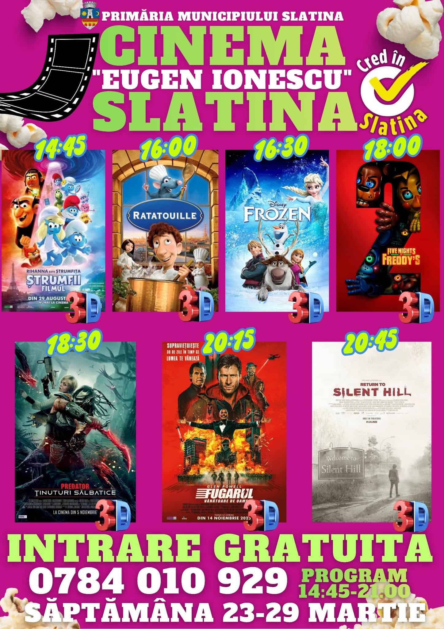 Începând de luni, 23 martie, Cinema „Eugen Ionescu” Slatina își așteaptă cinefilii cu o selecție variată de filme, potrivite atât pentru copii, cât și pentru adulți. De la animații îndrăgite până la blockbustere spectaculoase. Intrarea este liberă pe baza programărilor efectuate la următorul număr de telefon: 0784.010.929.