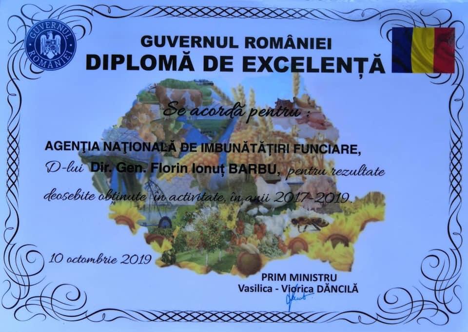 După muncă și răsplată! Florin Barbu, directorul Agenţiei Naţionale pentru Îmbunătăţiri Funciare, a primit din partea Guvernului României o diplomă de excelenţă pentru anii de activitate 2017-2019.