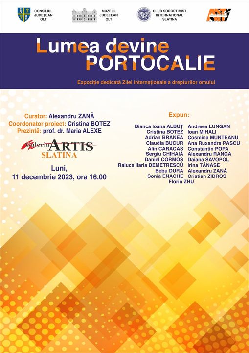 Pe simezele Galeriei „Artis” a Muzeului Județean Olt, se deschide, începând de luni, 11 decembrie, ora 16:00, expoziția de artă plastică „Lumea devine Portocalie”, expoziție dedicată onorării Zilei internaționale a drepturilor omului.