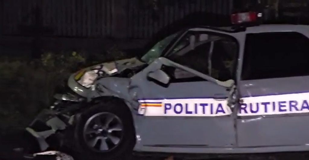 Mașină de poliţie, făcută praf şi aruncată în şanţ de şoferiţa unui BMW, care a ‘țâșnit’ pe contrasens