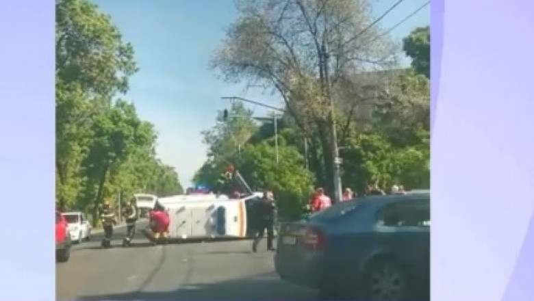 O ambulanță în care era o femeie însărcinată s-a răsturnat duminică în București, în urma unui accident în care a mai fost implicată o mașină.