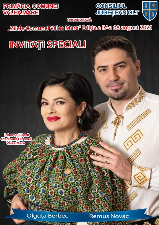 Conducerea Primăriei Valea Mare și Consiliul Local Valea Mare în frunte cu domnul primar – Iancu George Daniel , organizează cu susținerea Consiliului Județean Olt , în data de 08 august 2021 – ,, Zilele Comunei Valea Mare ,, -Editia a –IV- a.