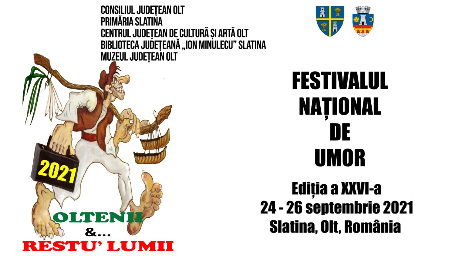 Centrul Judeţean de Cultură și Artă Olt, în colaborare cu Consiliul Judeţean Olt, Primăria Municipiului Slatina, Consiliul Local al Municipiului Slatina, Biblioteca Judeţeană „Ion Minulescu“, Muzeul Judeţean Olt, Centrul Cultural „Eugen Ionescu“ Slatina, Palatul Copiilor „Adrian Băran“, organizează la Slatina a XXVI-a ediţie a Festivalului – Concurs de Umor „Oltenii &… Restu’ Lumii“, în prima lună de toamnă, în perioada 24 – 26 septembrie 2021.