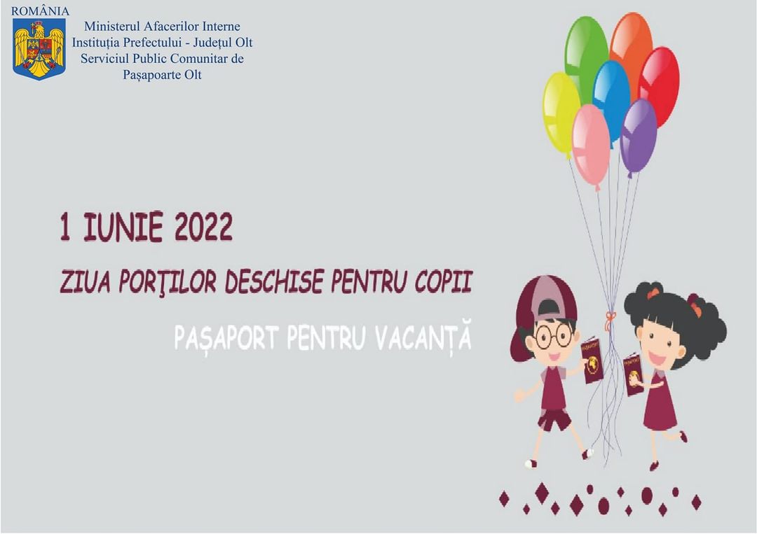 Prefectura Olt anunță că de Ziua Internațională a Copilului, Serviciul Public Comunitar de Pașapoarte Olt își deschide porțile și îi așteaptă pe copii cu surprize inedite în cadrul evenimentului PAȘAPORT PENTRU VACANȚĂ.