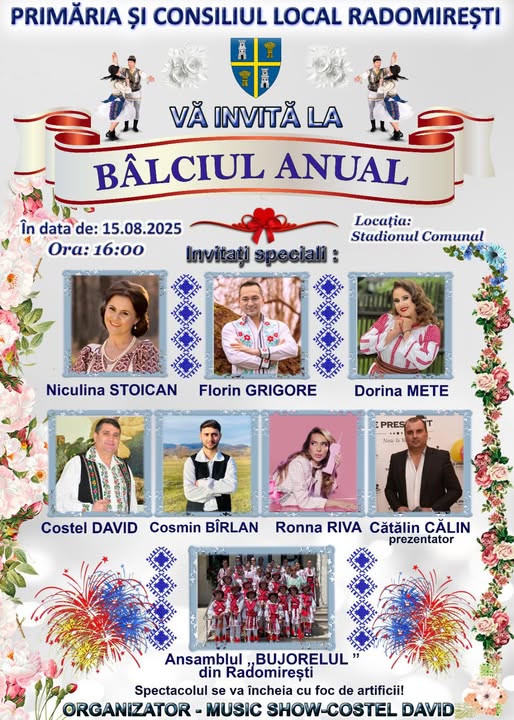 „Bună ziua! Stimați cetățeni, se apropie Sfânta Maria. Pe 15 August, ca în fiecare an, vă invităm la Bâlciul Anual care va avea loc pe Stadionul Comunal, începând cu ora 15:00, nu înainte de premierea unui număr de 18 elevi de la Școala Gimnazială Radomirești care au obținut la sfârșitul anului școlar 2023 – 2024 media peste 9, iar la final vom avea parte de un foc de artificii”, este declarația primarului Nicușor Sîia.