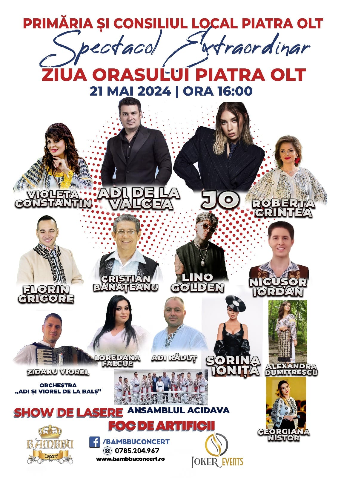 Pe lângă slătineanca Ioana Anuța – JO și Adi de la Vâlcea, pe scenă pentru a susține recitaluri vor mai urca Violeta Constantin, Roberta Crintea, Florin Grigore, Cristian Bănățeanu, Lino Golden, Nicușor Iordan, Sorina Ioniță, Alexandra Dumitrescu, Georgiana Nistor și Orchestra „Adi și Viorel de la Balș” – Viorel Zidaru, Loredana Falcue și Adi Răduț. Totodată, momente artistice vor oferi membrii Ansamblului „Acidava” din localitate.