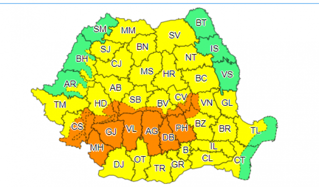 Potrivit ANM, în nordul Olteniei și al Munteniei, în sudul Banatului, precum și în Carpații Meridionali și de Curbură vor fi perioade cu averse torențiale, zona fiind sub cod portocaliu