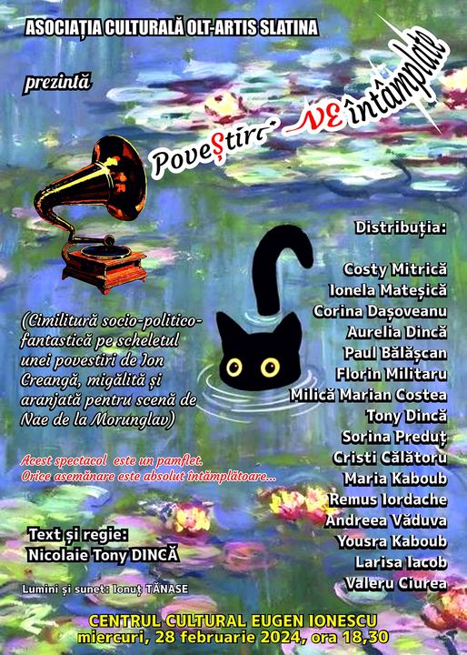 Miercuri, 28 februarie 2024, la ora 18,30, la Centrul Cultural Eugen Ionescu se joacă spectacolul de teatru „PoveȘtiri neîntâmplate”, al Asociației Oltartis, o comedie pe textul și în regia lui Nicolaie Tony Dincă, în interpretarea actorilor: Costy Mitrică, Ionela Mateșică, Corina Dașoveanu, Aurelia Dincă, Paul Bălășcan, Florin Militaru, Milică Marian Costea, Tony Dincă, Sorina Preduț, Cristi Călătoru, Maria Kaboub, Remus Iordache, Andreea Văduva, Yousra Kaboub, Larisa Iacob, Valeru Ciurea.