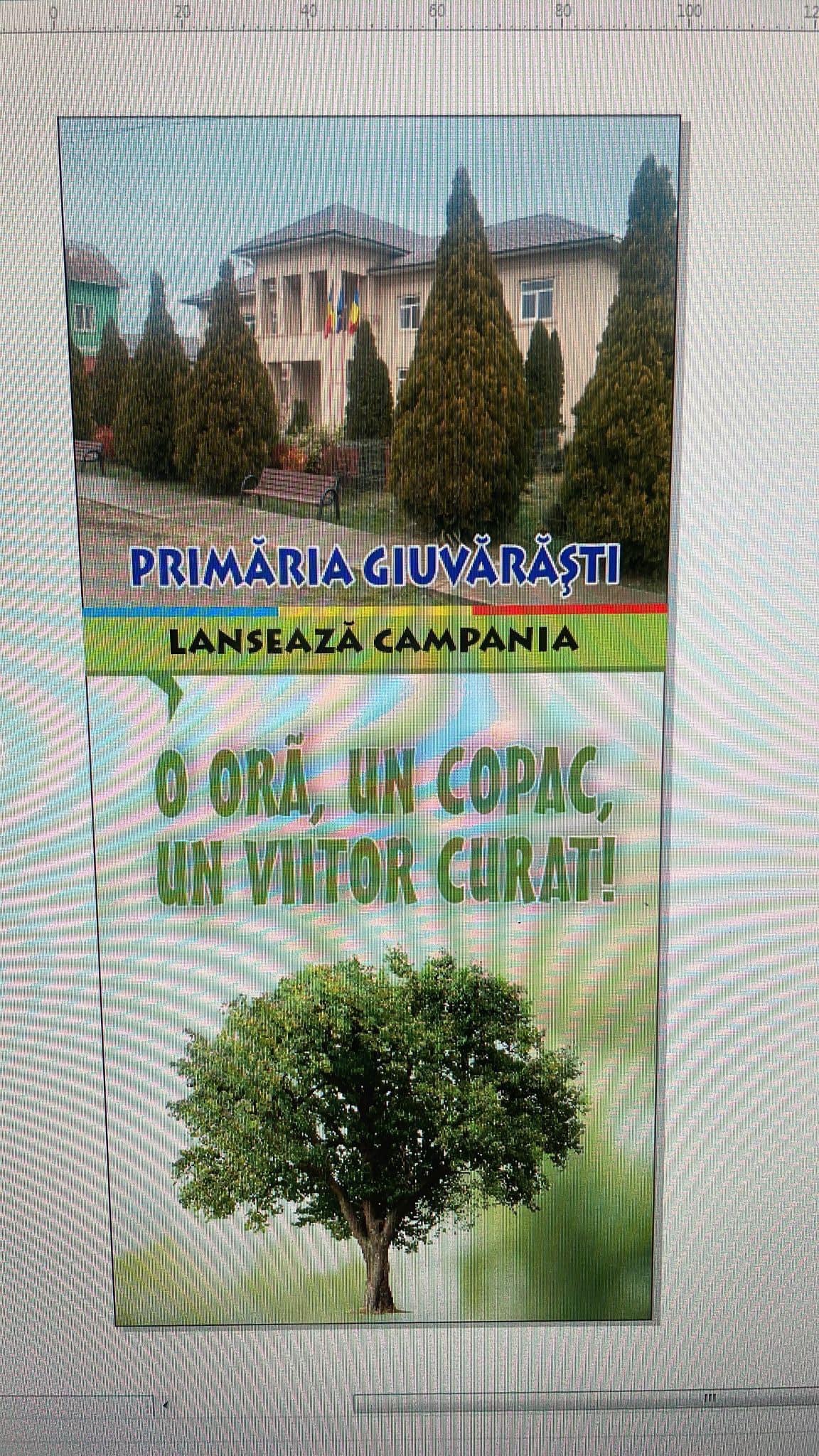 Primăria Giuvărăști în colaborare cu Consiliul Local Giuvărăști lansează campania “O oră, un copac, un viitor curat”. Acțiunea va avea loc în data de 2 Decembrie și constă în plantarea de arbori pentru a lăsa generațiilor viitoare un mediu verde cu aer curat: