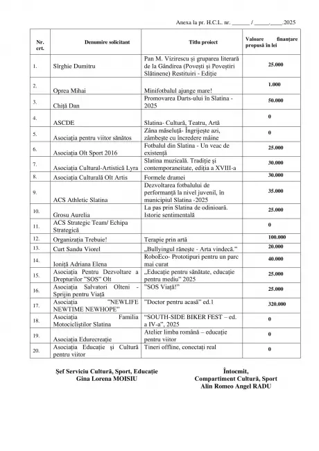 Potrivit proiectului hotărârii acordarea finanțărilor nerambursabile din bugetul local este realizată „în conformitate cu prevederile Legii nr. 350/2005, precum și ale Programului anual propriu al Consiliului Local al municipiului Slatina, aprobat prin Hotărârea Consiliului Local nr. 107/20.03.2025, în baza cărora Comisia de evaluare şi selecționare a proiectelor a emis Raportul de evaluare nr. 51579/22.05.2025”.