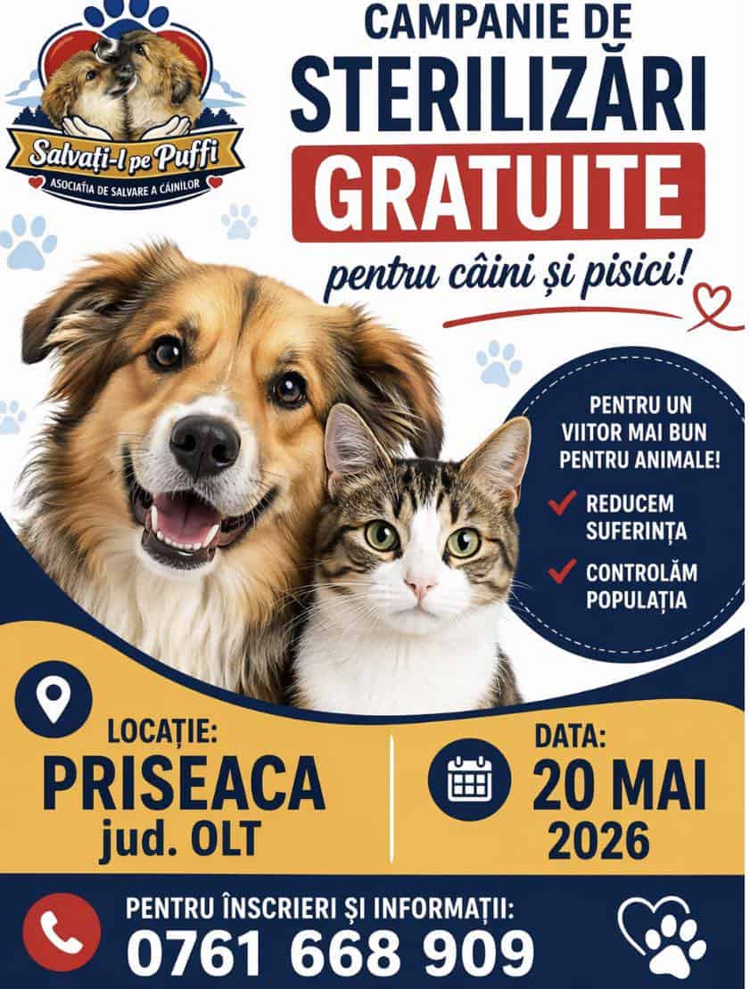 Asociației ”Salvați-l pe Puffi” în parteneriat cu Primăria Priseaca organizează pe 20 mai o nouă campanie de sterilizare gratuită a animalelor de companie.