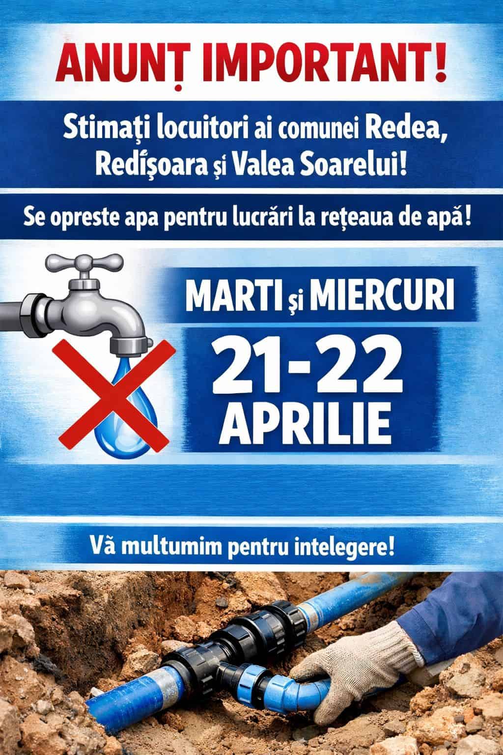 ”Vă informăm că alimentarea cu apă va fi întreruptă în perioada 21.04.2026, ora 08:00 – 22.04.2026, ora 18:00, în vederea lucrărilor de branșament la rețeaua de apă potabilă din cadrul proiectului „Extindere sisteme de alimentare cu apă și canalizare în comuna Redea, județul Olt.” Vă rugăm să vă asigurați un stoc de apă necesar pentru această perioadă. Vă mulțumim pentru înțelegere!” este mesajul autorităților locale din comuna Redea.