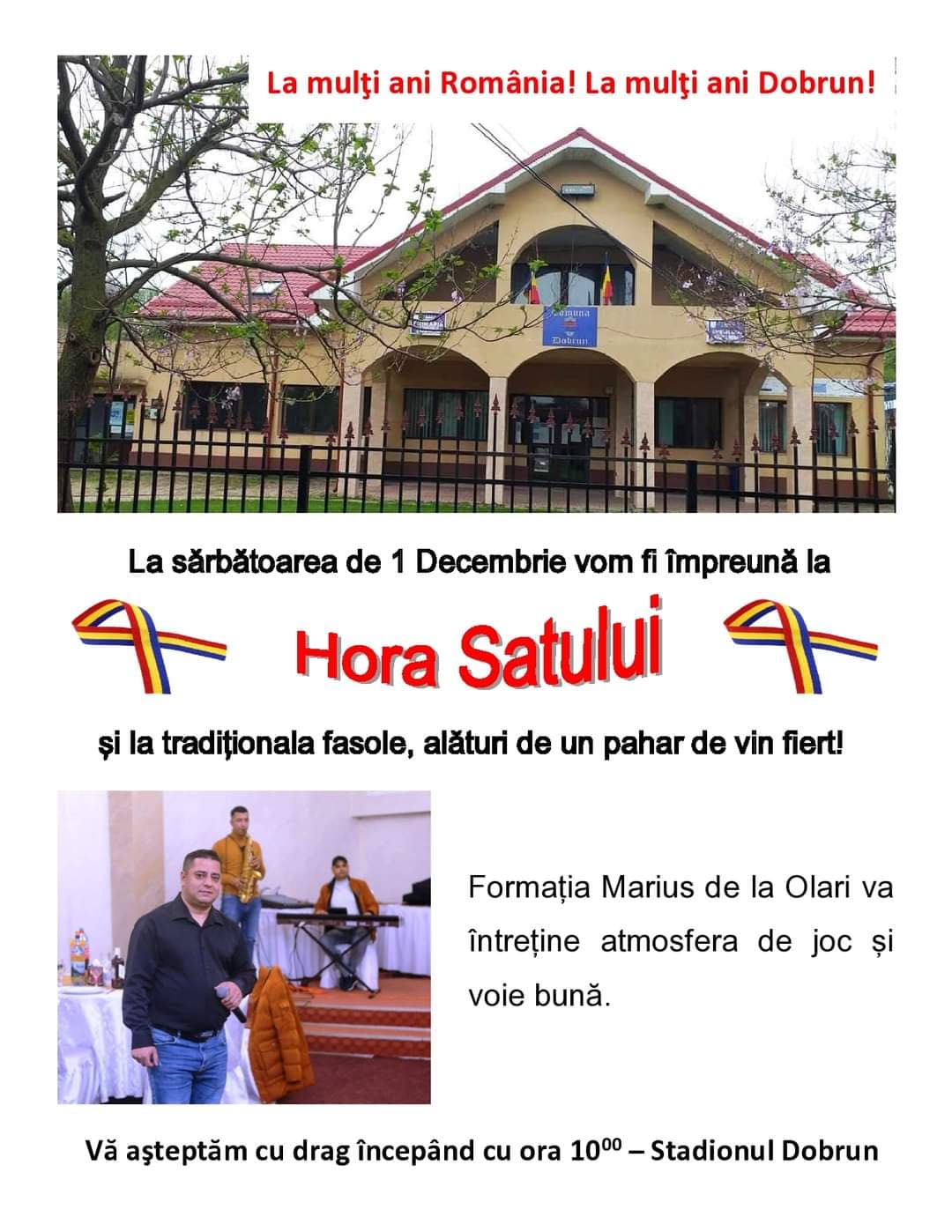 Primăria Dobrun organizează anul acesta mai multe manifestări dedicate zilei de 1 Decembrie, Ziua Națională a Românie. Stadionul comunal și noua sală de sport sunt locațiile de desfășurare a acestora, iar printre ele se numără Hora Satului și o competiție inter-școlară de fotbal