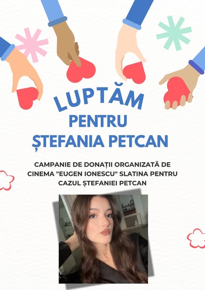 Cinema „Eugen Ionescu” Slatina se alătură campaniei de donații pentru Ștefania Petcan, o tânără care are nevoie de sprijinul nostru în lupta sa. Începând de astăzi, la cinema veți găsi o urnă dedicată acestei campanii, iar orice contribuție, oricât de mică, poate face o mare diferență. Haideți să demonstrăm, încă o dată, că Slatina este o comunitate unită, în care solidaritatea și bunătatea înving orice obstacol!