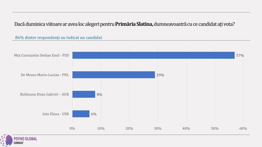 Potrivit unui sondaj realizat de o instituție respectată și specializată în măsuratori sociologice, Psiho Global Consult, pe un eșantion de 1.000 de chestionare completate între 25-27 aprilie, actualul primar al municipiului Slatina, Emil Moț, va câștiga detașat alegerile de duminică cu 57% din voturi: