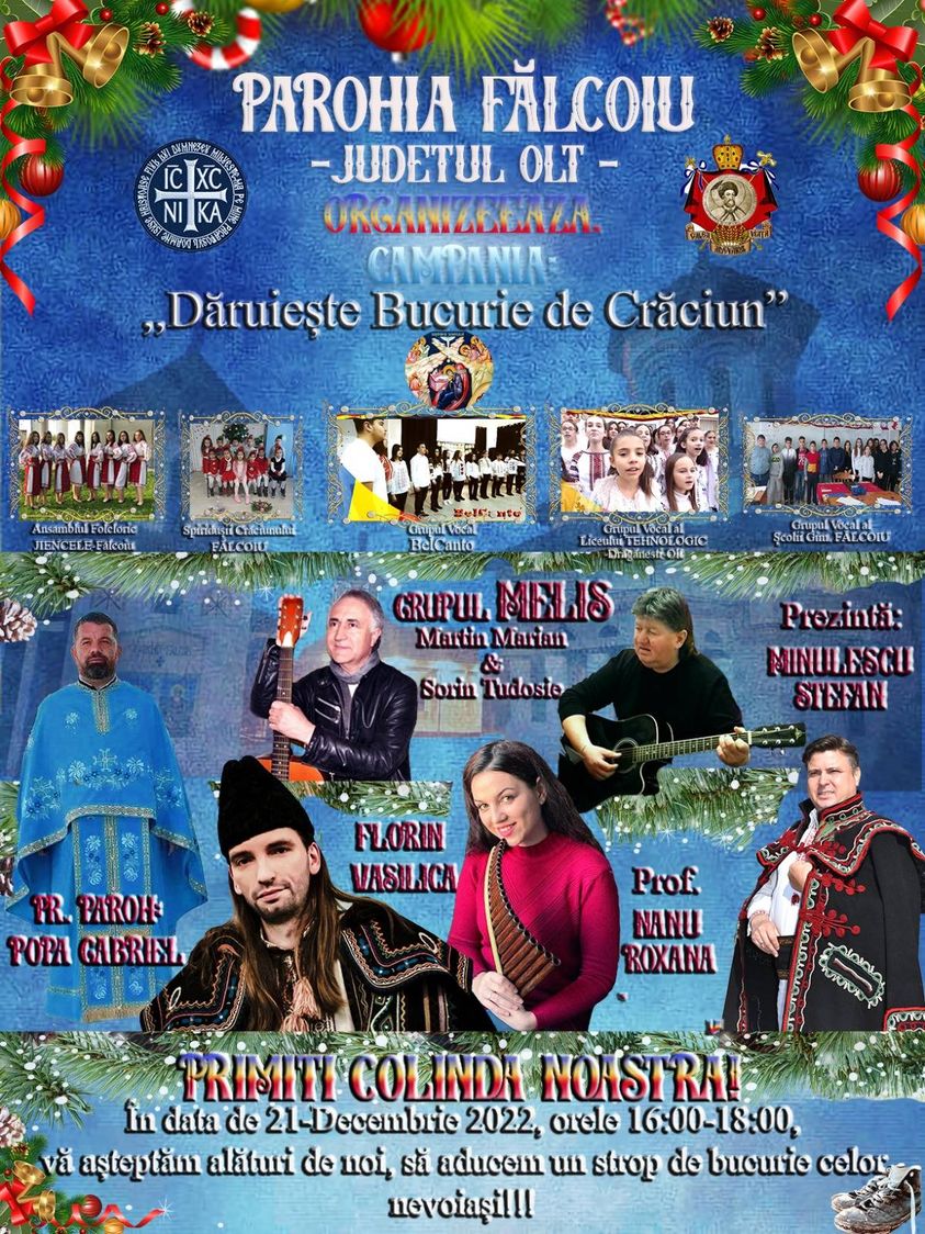 ”Am primit cu câteva minute în urmă confirmarea faptului ca, la Spectacolul nostru, va veni și marele artist popular FLORIN VASILICA, drept pentru care am modificat puțin afișul de prezentare al evenimentului.Este o onoare sa îl avem în mijlocul nostru pe binecunoscutul interpret care, împreună cu colegii săi, vor urca pe scena din curtea bisericii noastre.SEARĂ DE COLINDE LA PAROHIA FALCOIU. MIERCURI 21 DECEMBRIE ORA 16.00. Spectacol la care sunteți așteptați cu toții!Copiii vor primi Popcorn , Vata de zahar, Brioșe….Cei mici pot pune scrisorile către Mos Crăciun în CUTIA POSTALĂ SANTA CLAUS și pot face fotografii în SANIA LUI MOS CRĂCIUN!”a declarat preotul Gabriel Popa
