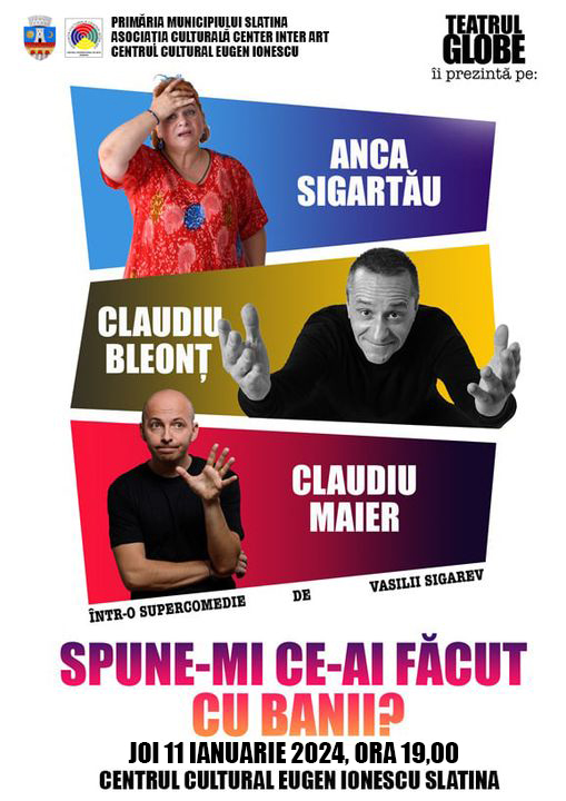 Joi, 11 ianuarie 2024, ora 19,00, Primăria municipiului Slatina și Asociația Culturală Center Inter Art vă invită la spectacolul cu piesa „SPUNE-MI CE-AI FĂCUT CU BANII”, o supercomedie de Vasilii Sigarev, cu Anca Sigartău, Claudiu Bleonț și Claudiu Maier.