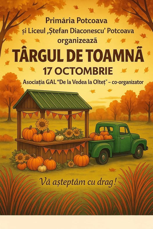 Primăria Orașului Potcoava, în parteneriat cu Liceul „Ștefan Diaconescu”, Asociația „Mândri ca suntem romi”, Asociația GAL „De la Vedea la Olteț”, Ansamblul „Murgulețu” Potcoava, grupul vocal „Mândruțele de la Olt” și Gabriel Liu, vă invită vineri, 17 octombrie 2025, la ora 10:00, la o nouă ediție a Târgului de Toamnă, un eveniment dedicat tradițiilor locale, comunității și bucuriei acestui frumos anotimp.