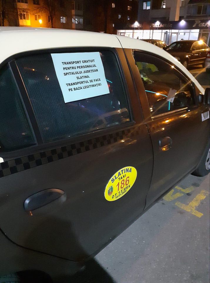 În această perioadă când coronavirusul ne ameninţă din toate părţile, iar unii se bat prin supermarketuri pentru un kilogram de făină sau unul de mălai, taximetriştii din Slatina îşi păstrează coloana vertebrală şi sar în sprijinul medicilor. Şoferii sunt dispuşi să ofere personalului Spitalului Judeţean de Urgenţă Slatina transport gratuit până la destinaţie doar pe baza legitimaţiei. Maşinile care au intrat în această campanie umanitară au lipit pe geamuri următorul mesaj: TRANSPORT GRATUIT PENTRU PERSONALUL SPITALULUI JUDEŢEAN SLATINA. TRANSPORTUL SE FACE PE BAZA LEGITIMAŢIEI”.
