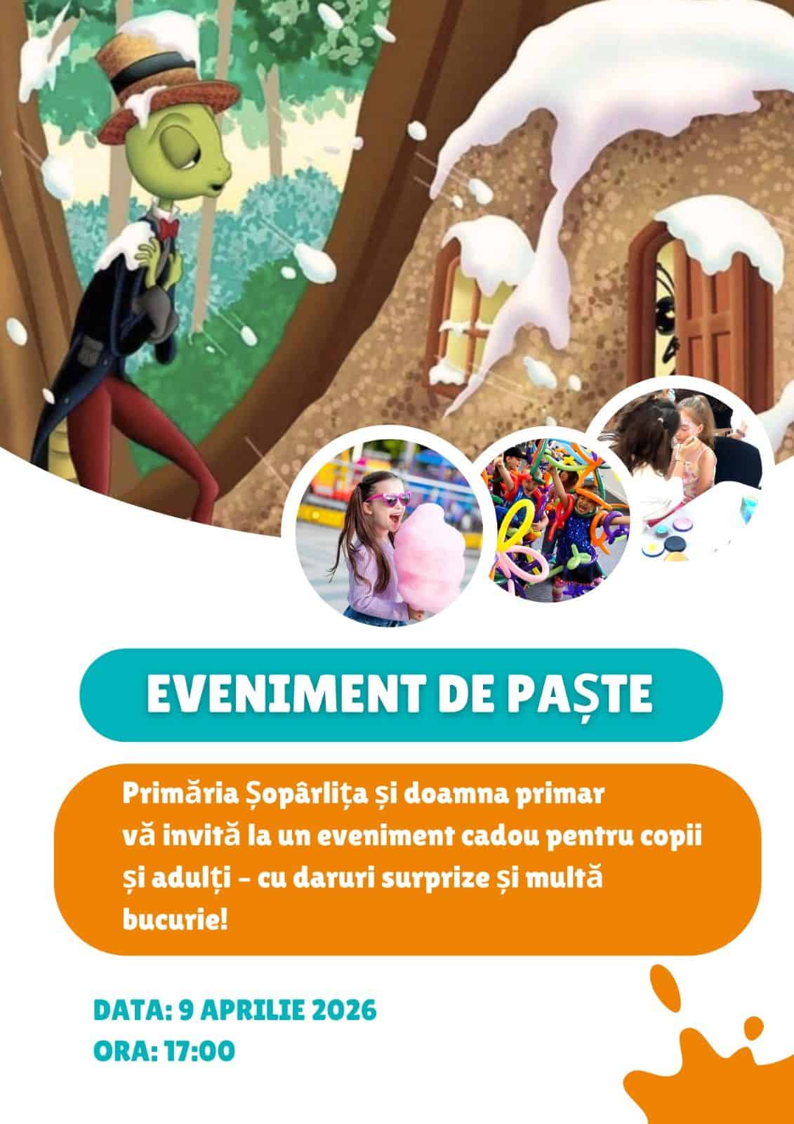 Veste bună pentru copiii din comuna Șopârlița. Teatrul București în colaborare cu edilul Marijana Trepăduș au pregătit o zi magică, pe 9 aprilie, ora 17:00, în parcul comunal din localitate. Evenimentul este organizat pentru a petrece Paștele într-un cadru magic, alături de Iepurașul cel hazliu.
