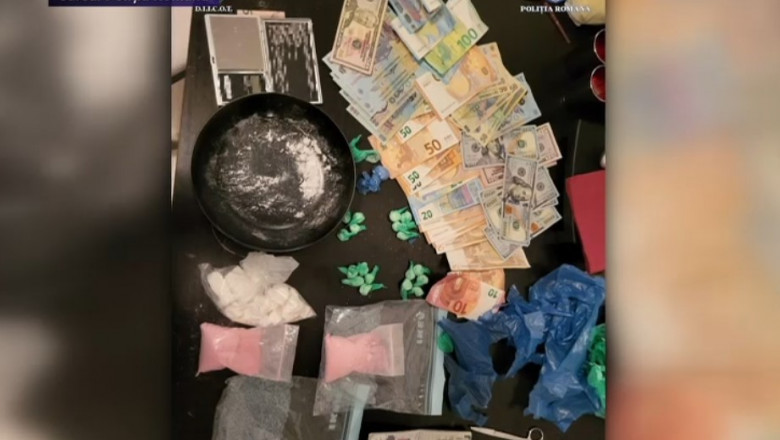 În urma unei percheziţii domiciliare, au fost găsite cantităţi de droguri (cocaină şi ketamină), instrumente pentru porţionare şi ambalare, precum şi sume de bani.