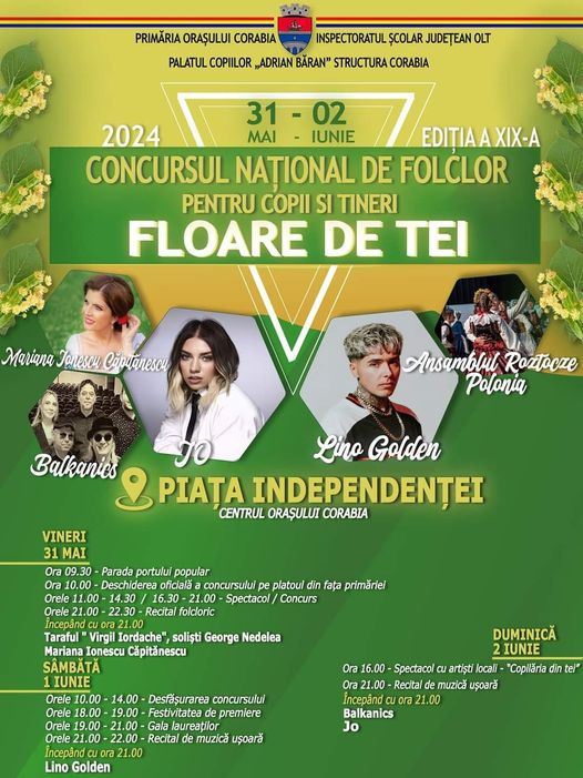 Manifestările vor demara Vineri dimineața cu o paradă a portului popular la care vor participa toți copiii. Pe scenă vor urca JO, Lino Golden, Marian Ionescu Căpitănescu