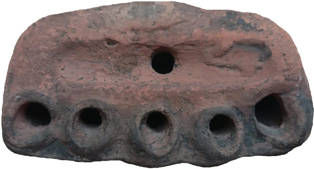 ”În colecția de arheologie a Muzeului Județean Olt se păstrează un opaiț rar, descoperit la Romula (Dacia Inferior / Reșca, com. Dobrosloveni, jud. Olt) în anul 1973. Corpul este aproximativ rectangular, baza este plată și este prevăzut cu cinci ciocuri scurte, cu orificii de ardere relativ înguste; culoare cărămizie.