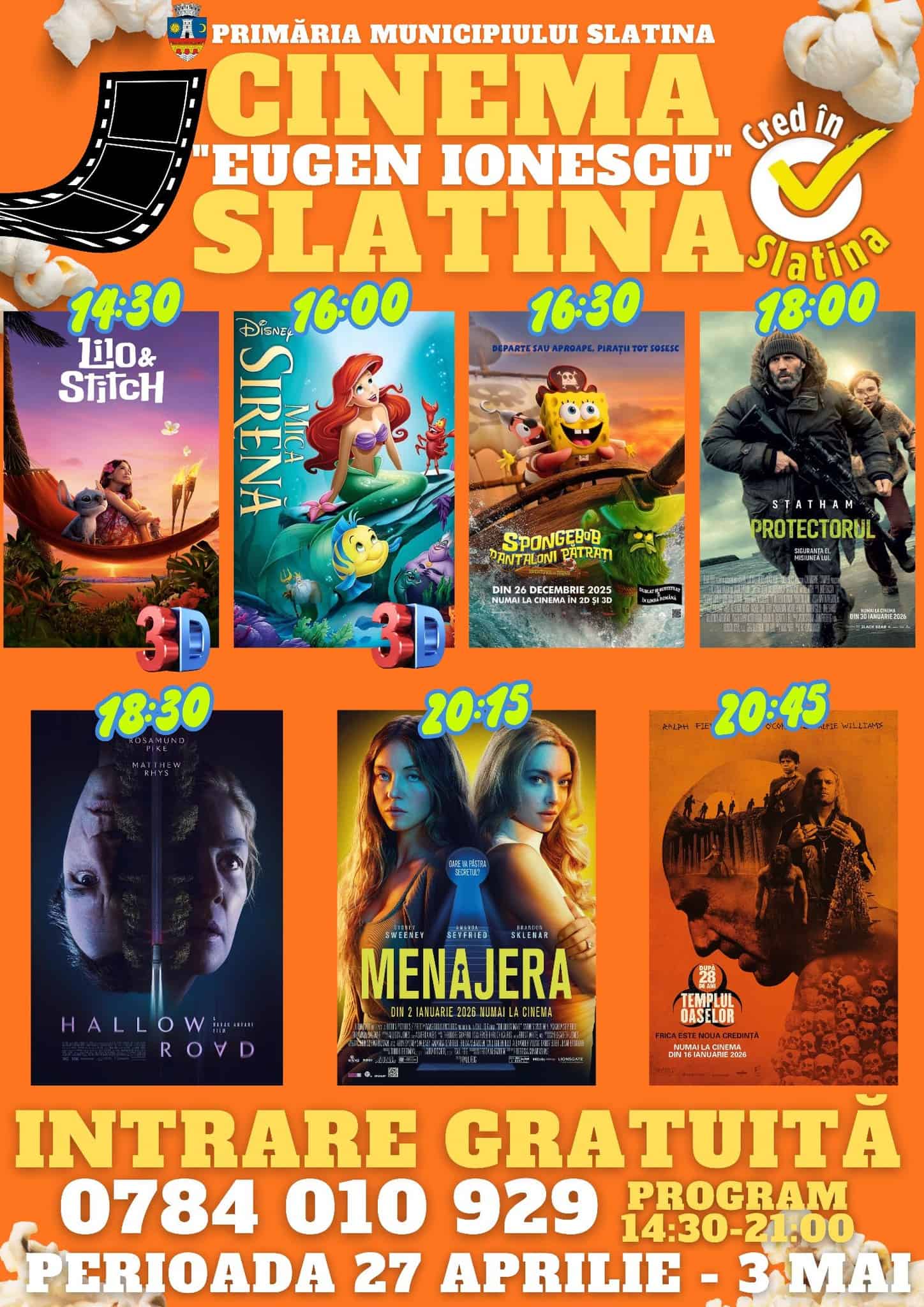 În perioada 27 aprilie – 3 mai, o nouă serie de filme îi așteaptă pe slătineni la Cinema ”Eugen Ionescu”. Filmele sunt pentru toate gusturile, de la animații pentru cei mici până la thrillere și acțiune intensă. Intrarea este gratuită, pe baza rezervărilor efectuate zilnic, între 14:30-21:00, la numărul de telefon: 0784.010.929.