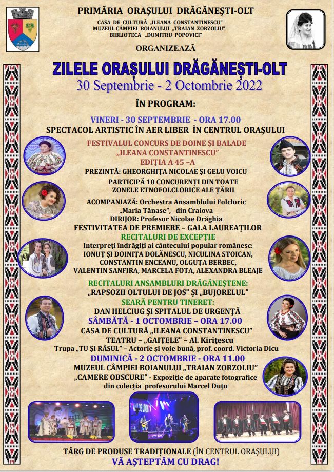 La finalul lunii oraşul Drăgăneşti Olt îmbracă pentru trei zile haine de sărbătoare. Sunt zilele localităţii, vineri, 30 septembrie, va fi organizată o nouă ediţie a Festivalului „Ileana Constantinescu”, iar în zilele de sâmbătă şi duminică se vor desfăşura mai multe manifestări culturale, dar şi un târg de toamnă cu produse tradiţionale.